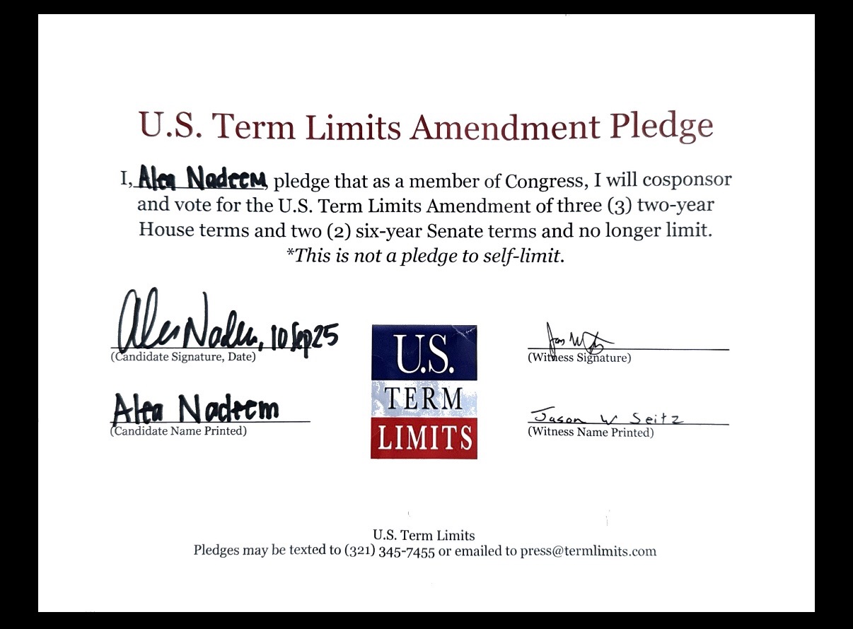 Washington D.C. – U.S. Term Limits (USTL), the leader in the non-partisan national movement to limit terms for elected officials, praises 2026 U.S. House of Representatives candidate for Ohio, Alea Nadeem (district 9), for signing the pledge for an amendment to term limit Congress.