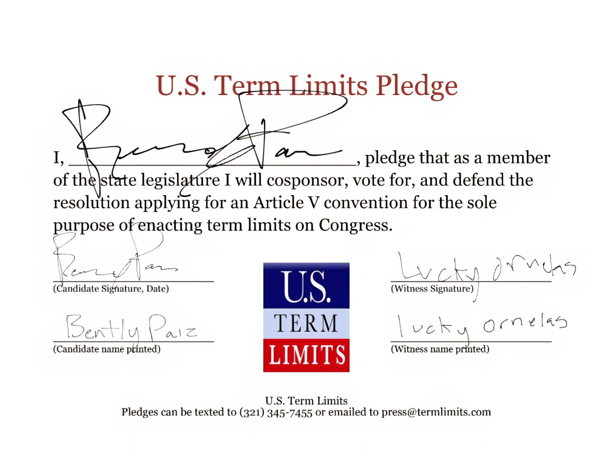 Bently Paiz Pledges to Support Congressional Term Limits
