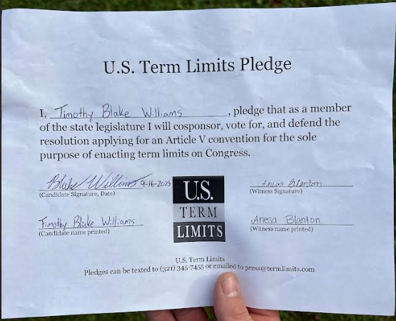 Pikeville, KS- U.S. Term Limits (USTL), the leader in the national, non-partisan movement to limit terms for elected officials, is gathering support from state lawmakers across the nation. Its mission is to get 34 states to apply for an amendment proposal convention specific to term limits on Congress. 2026 Kansas state senate candidate Blake Williams (district 31), has committed support for term limits on Congress by signing the term limits convention pledge.