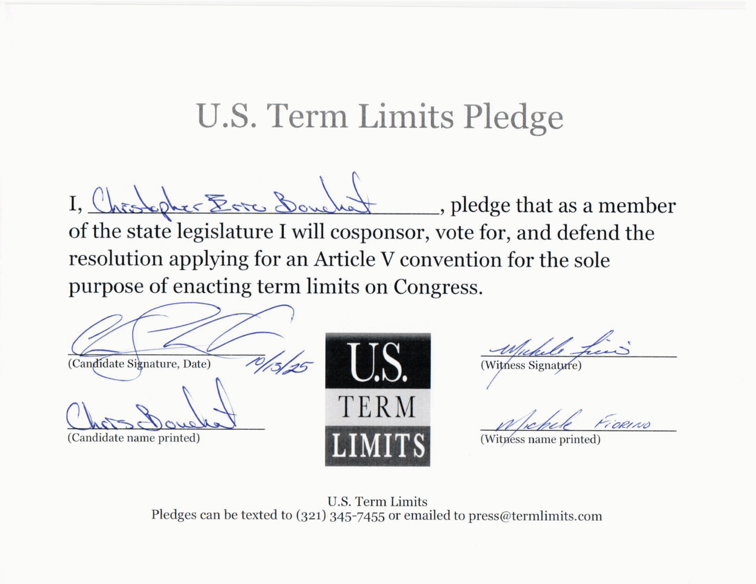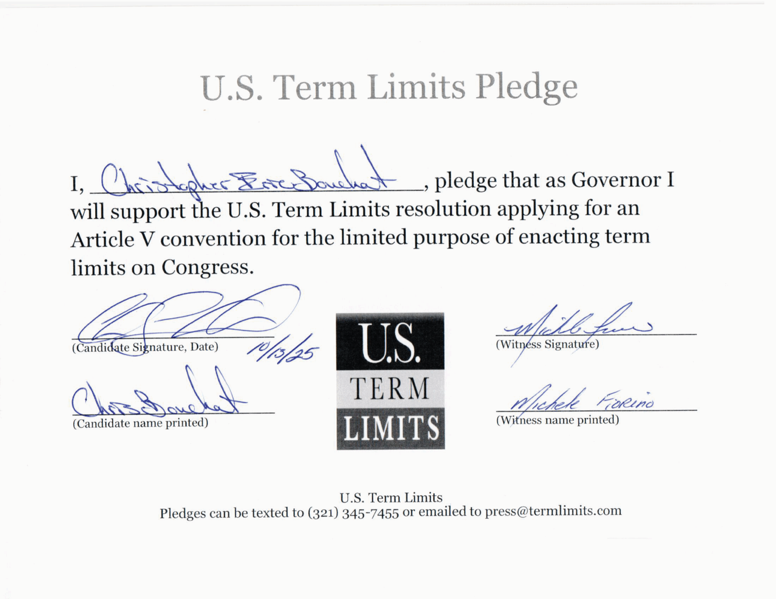 The U.S. Term Limits pledge is provided to candidates and members of state legislatures. It reads, “I pledge that as Governor, I will support the U.S. Term Limits resolution applying for an Article V convention for the limited purpose of enacting term limits on Congress.”