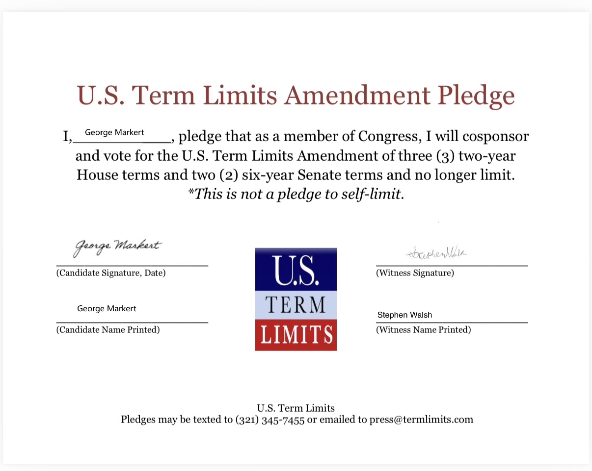 Washington D.C. – U.S. Term Limits (USTL), the leader in the non-partisan national movement to limit terms for elected officials, praises 2026 U.S. Senate candidate for Colorado, Col. George Markert (USMS Ret.), for signing the pledge for an amendment to term limit Congress. Previously, candidate Janak Joshi also signed the pledge.
