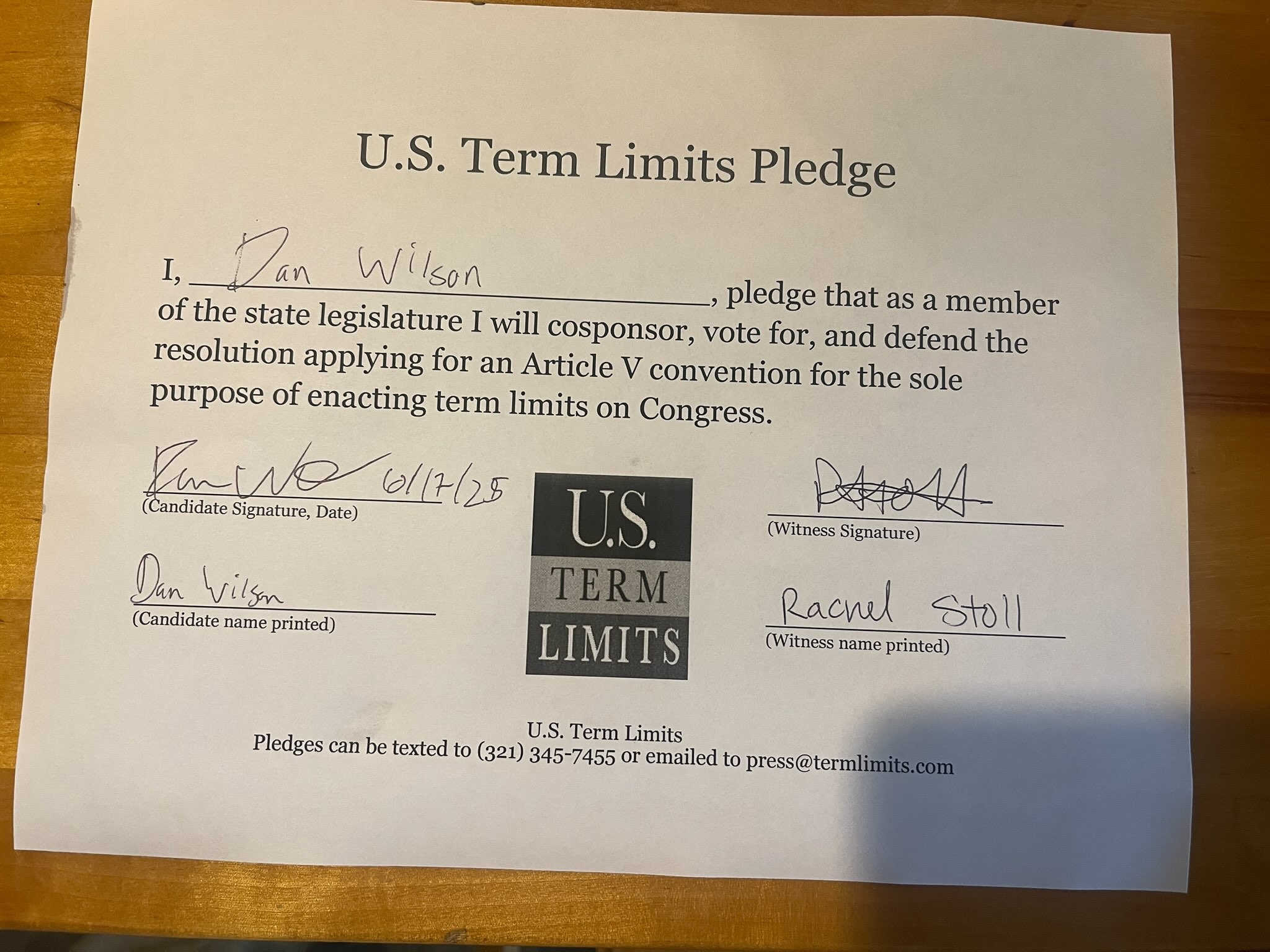 Winona, MN – U.S. Term Limits (USTL), the leader in the national, non-partisan movement to limit terms for elected officials, is gathering support from state lawmakers across the nation. Its mission is to get 34 states to apply for an amendment proposal convention specific to term limits on Congress. 2026 Minnesota state house candidate, Dan Wilson (district 26A), has committed support for term limits on Congress by signing the term limits convention pledge.