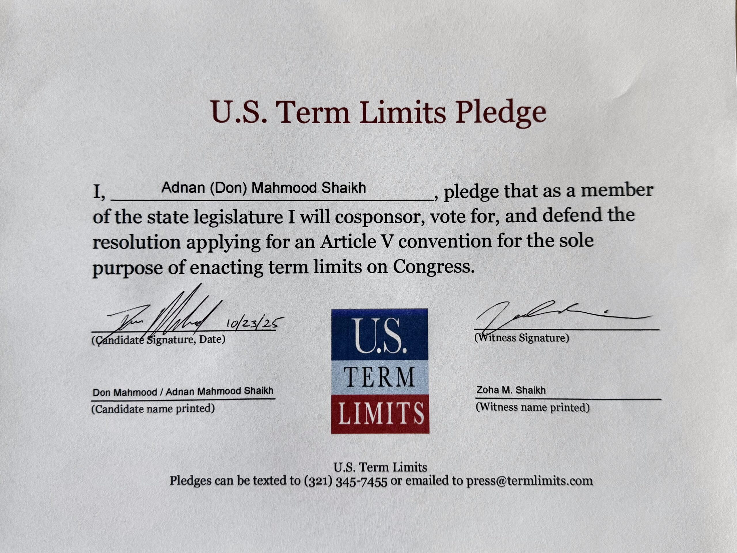 Don Mahmood Pledges to Support Congressional Term Limits
