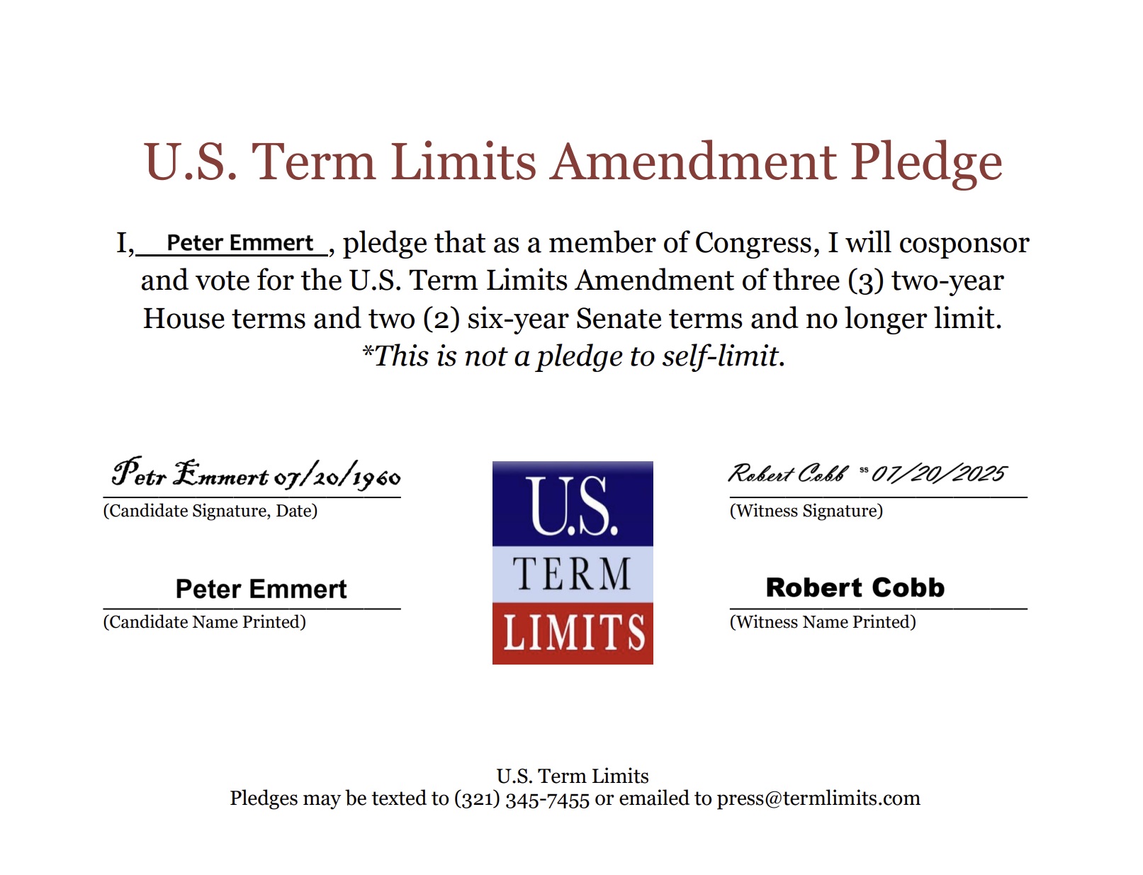 The U.S. Term Limits amendment pledge is provided to every announced candidate for federal office. It reads, “I pledge that as a member of Congress, I will cosponsor and vote for the U.S. Term Limits amendment of three (3) House terms and two (2) Senate terms and no longer limit.”
