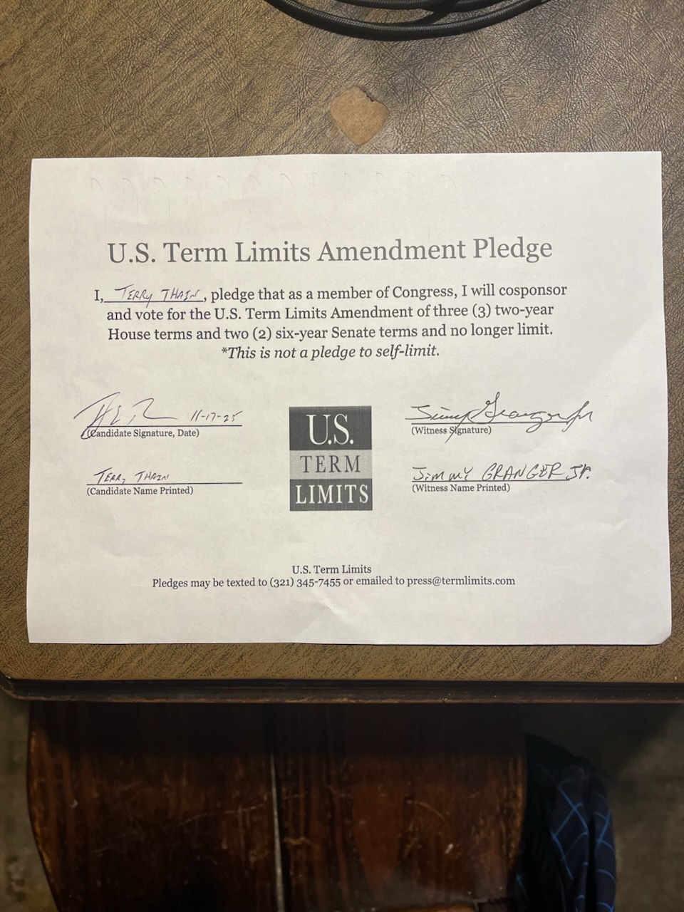Washington D.C. – U.S. Term Limits (USTL), the leader in the non-partisan national movement to limit terms for elected officials, praises 2026 U.S. House candidate for Texas, Terry Thain (district 9), for signing the pledge for an amendment to term limit Congress. Previously, candidates Dan Mims, Briscoe Cain, Pete Emmert and Alexandria Butler also signed the pledge.