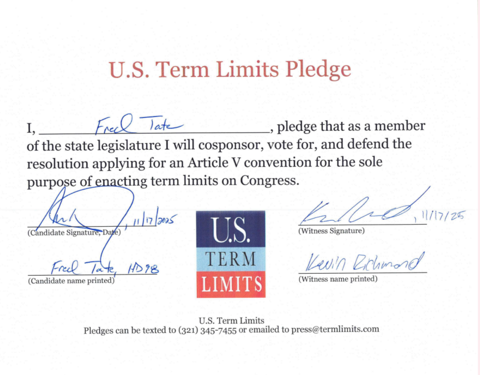 Grapevine, TX – U.S. Term Limits (USTL), the leader in the national, non-partisan movement to limit terms for elected officials, is gathering support from state lawmakers across the nation. Its mission is to get 34 states to apply for an amendment proposal convention specific to term limits on Congress. 2026 Texas state house candidate, Fred Tate (district 98), has committed support for term limits on Congress by signing the term limits convention pledge. Previously, candidate Armin Mizani also signed the pledge.