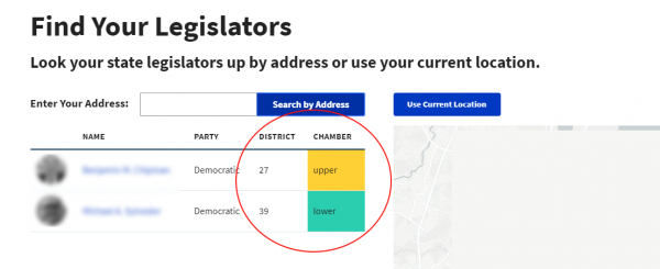 - Find your legislators to look up your senate (upper) and house (lower) districts.