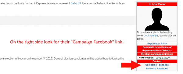 - Click on the candidate’s name and find their “Campaign Facebook” link.
