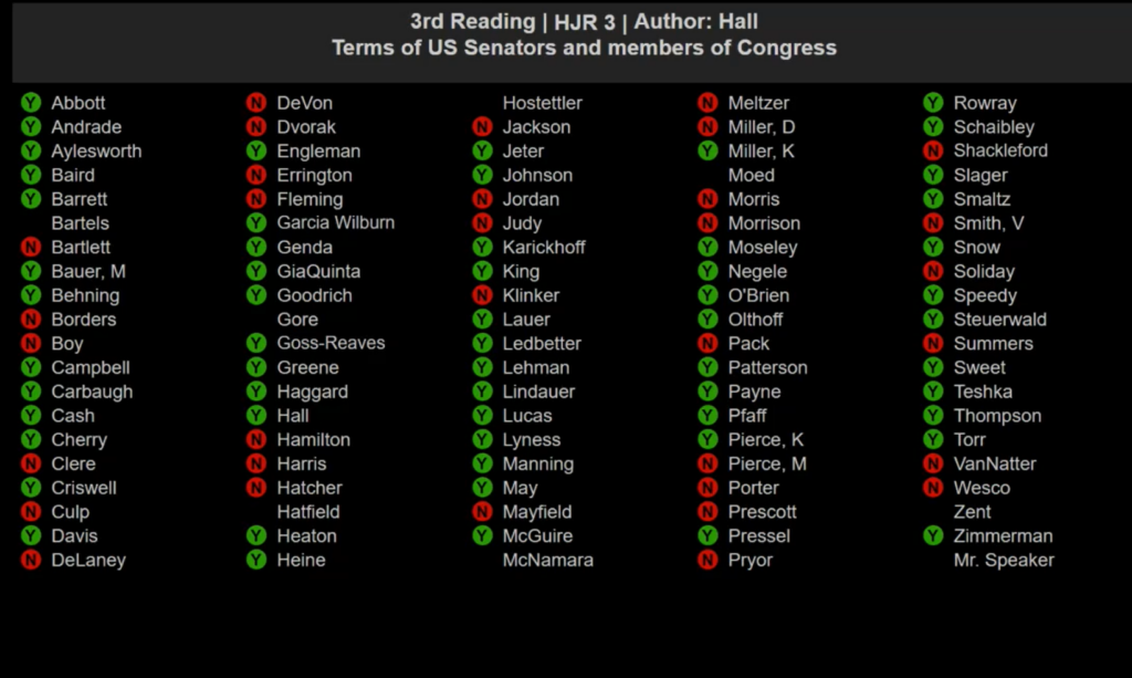 Indianapolis, IN — The Indiana State House just passed House Joint Resolution 3 (HJR3), which seeks to propose a congressional term limits amendment to the U.S. Constitution. The effort, led by Rep. Dave Hall, co-authored by Reps. Jeter, Karickhoff and Kyle Miller and spearheaded by the nonpartisan nonprofit U.S. Term Limits, passed with bipartisan support of 59 yeas and 33 nays.