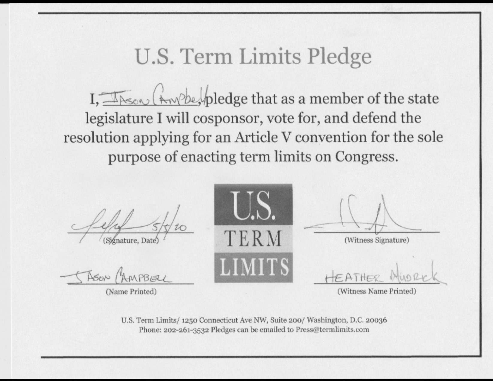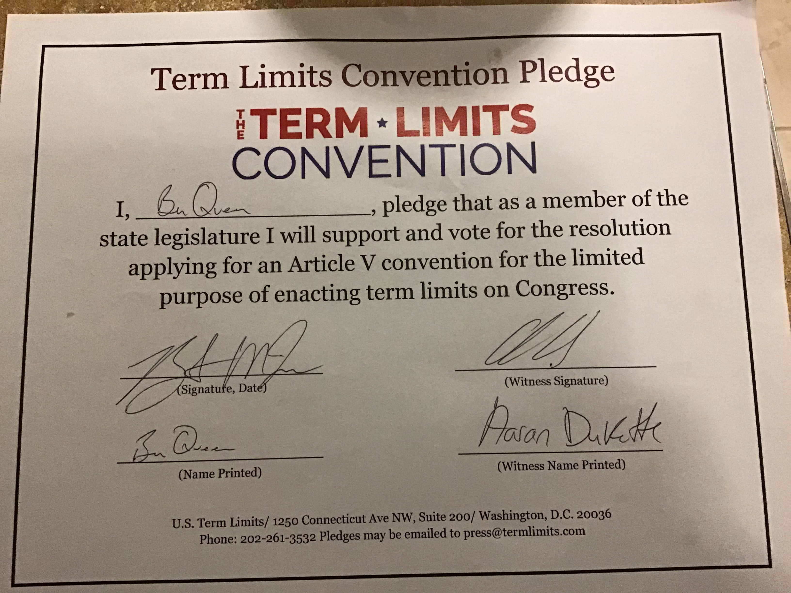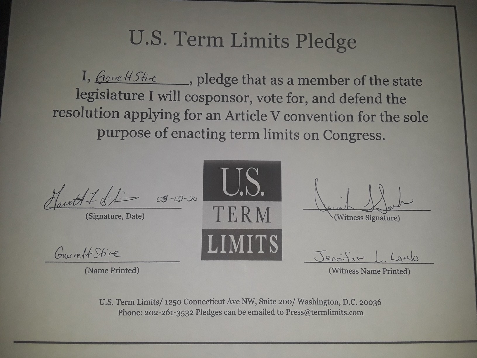 The U.S. Term Limits pledge is provided to candidates and members of state legislatures. It reads, “I pledge that, as a member of the state legislature, I will cosponsor, vote for, and defend the resolution applying for an Article V convention for the limited purpose of enacting term limits on Congress.”