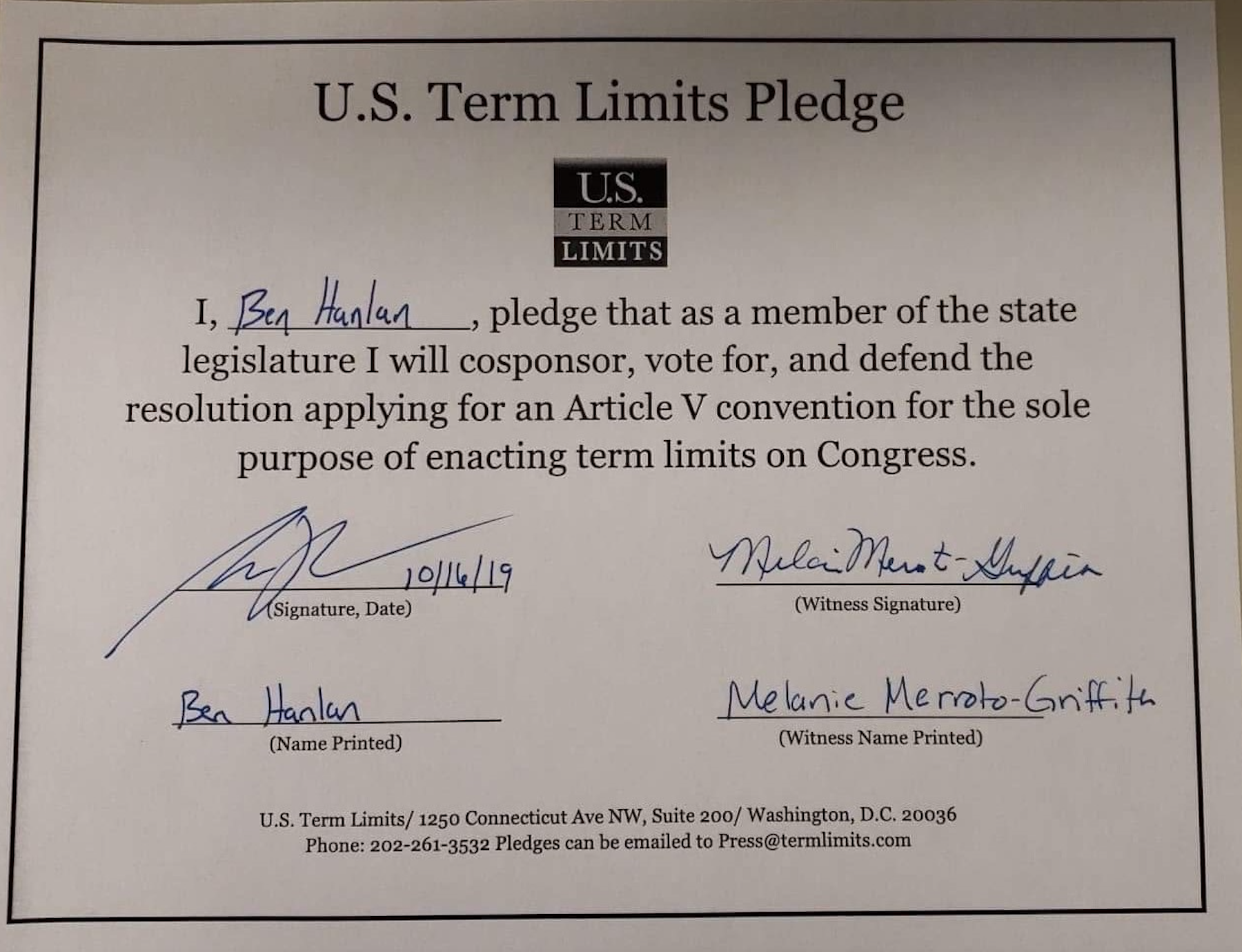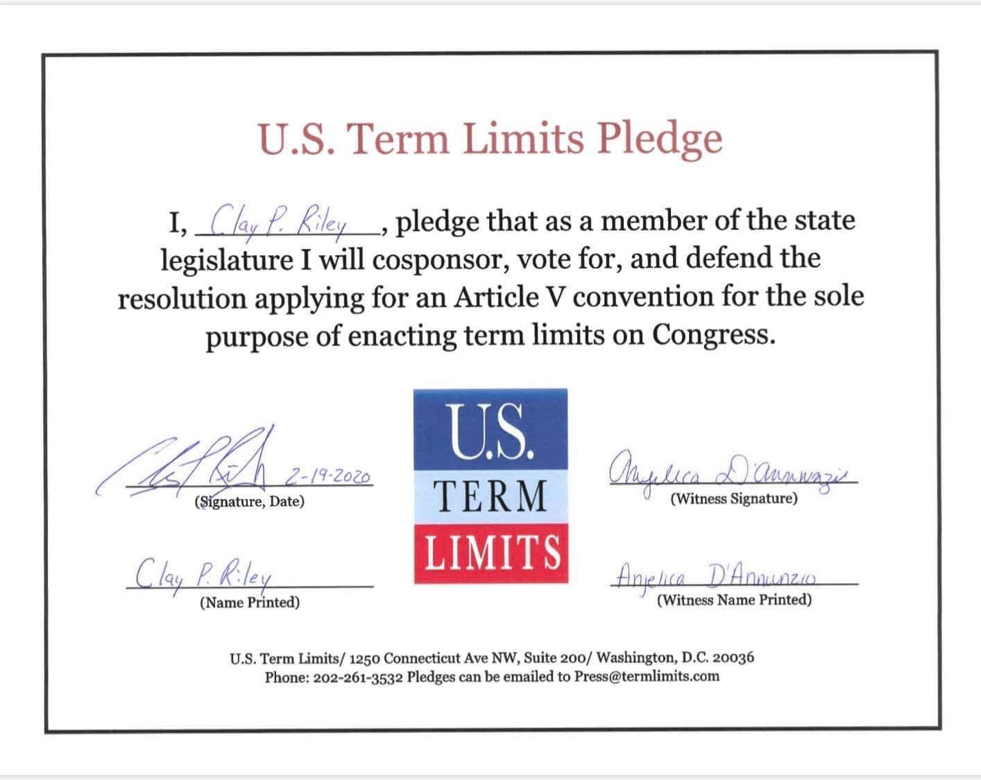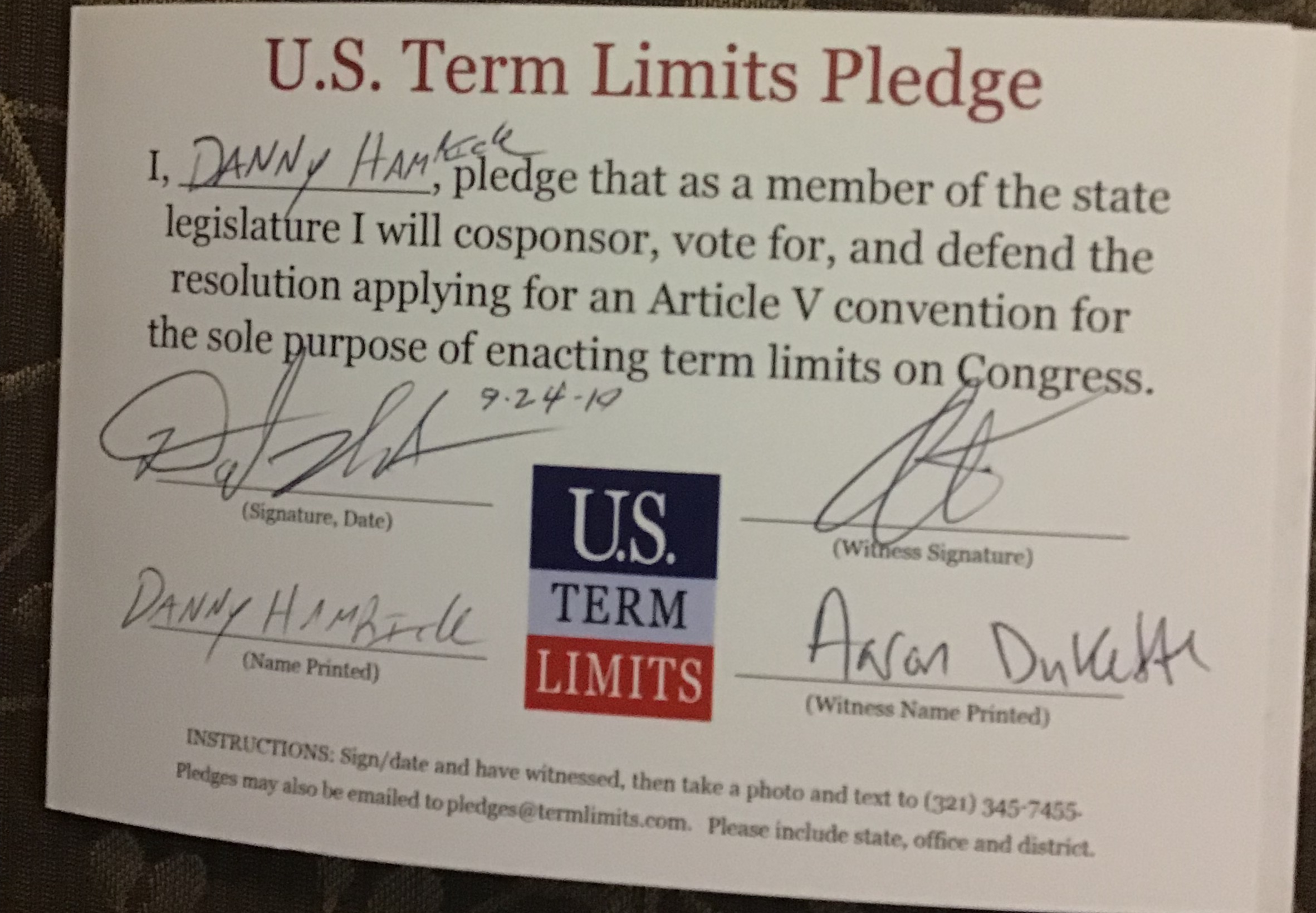 The U.S. Term Limits pledge is provided to candidates and members of state legislatures. It reads, “I pledge that, as a member of the state legislature, I will cosponsor, vote for, and defend the resolution applying for an Article V convention for the limited purpose of enacting term limits on Congress.”