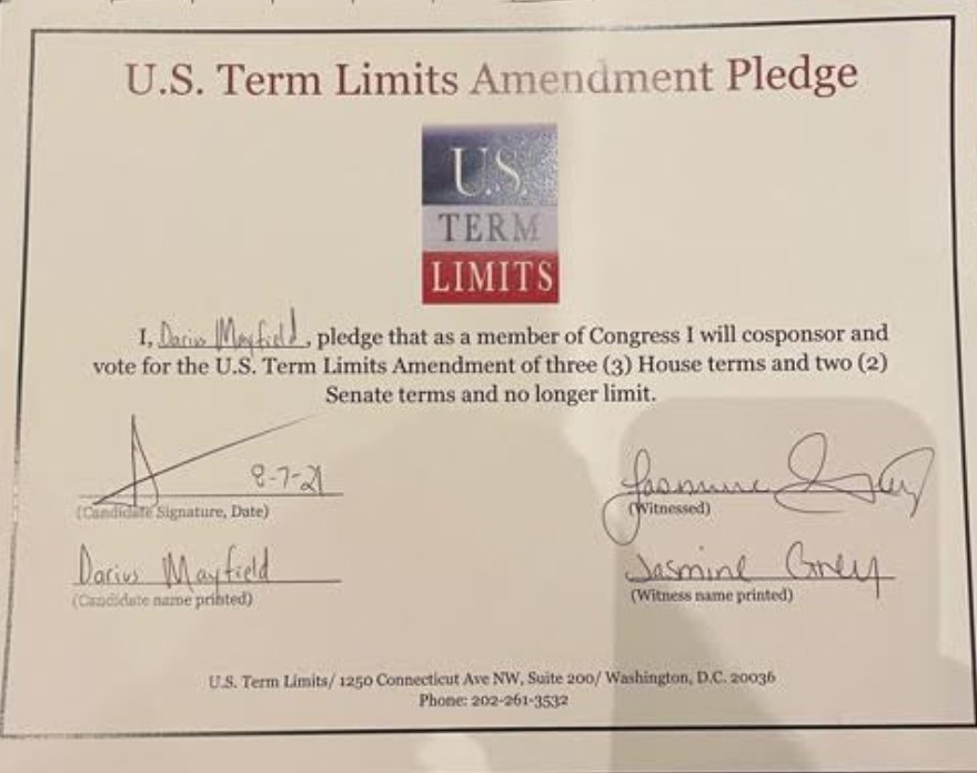 The U.S. Term Limits amendment pledge is provided to every announced candidate for federal office. It reads, “I pledge that as a member of Congress, I will cosponsor and vote for the U.S. Term Limits amendment of three (3) two-year House terms and two (2) six-year Senate terms and no longer limit.”