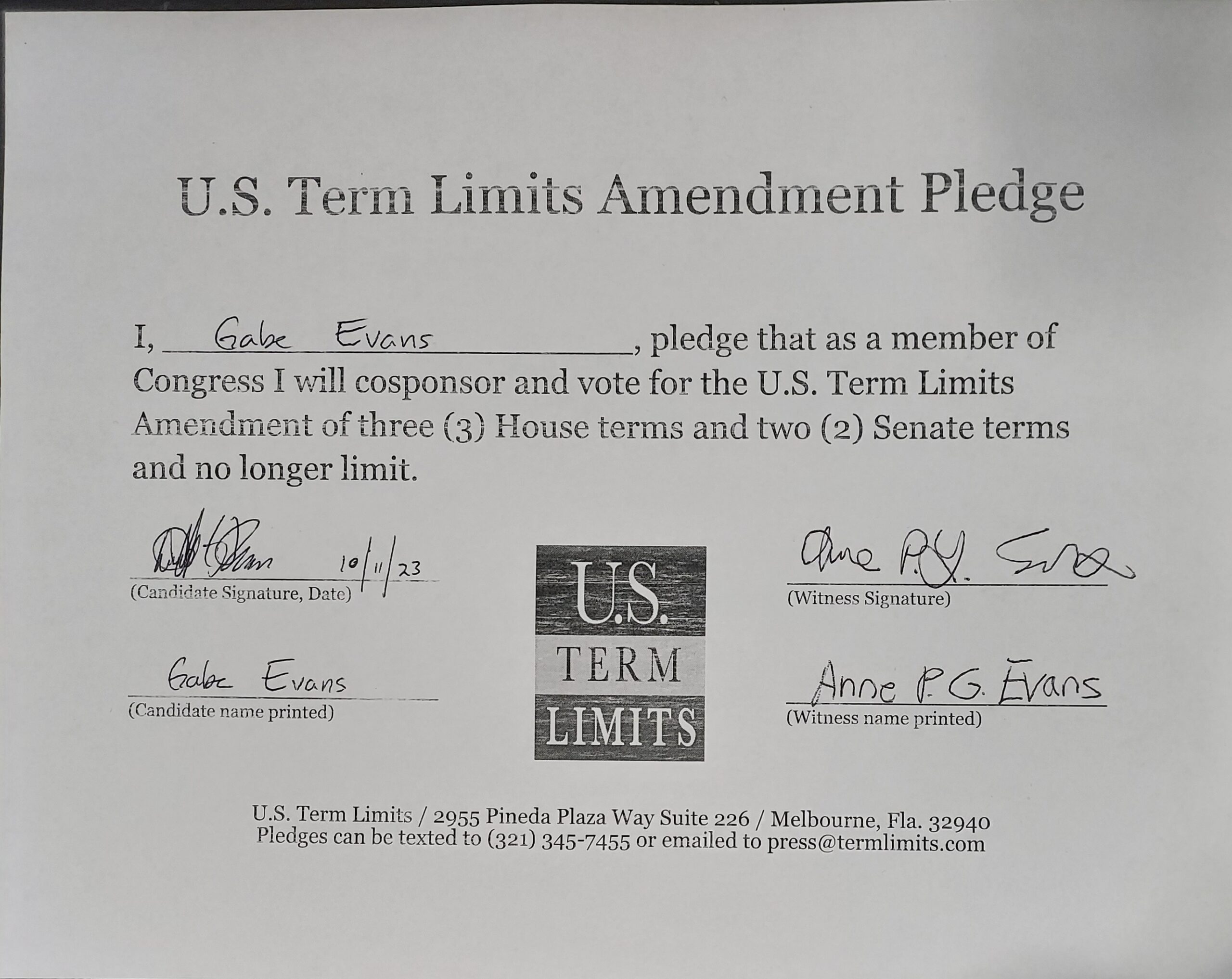 The U.S. Term Limits amendment pledge is provided to every announced candidate for federal office. It reads, “I pledge that as a member of Congress, I will cosponsor and vote for the U.S. Term Limits amendment of three (3) two-year House terms and two (2) six-year Senate terms and no longer limit.”