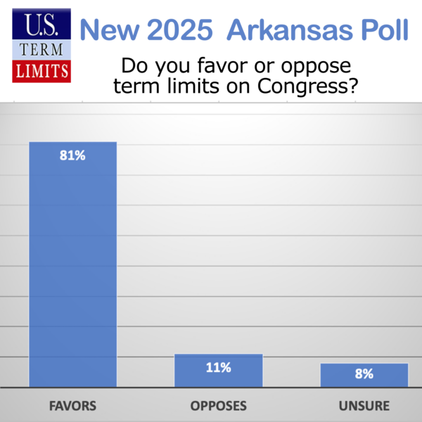 Little Rock, AR – A new poll of registered Arkansas voters conducted by RMG Research on January 2-8, 2025 found an overwhelming 81% favor term limits for Congress. This reflects sentiments in favor of congressional term limits in other states as well. The poll showed that 75% of Arkansans would want their state senator and state representative to favor legislation calling for a convention to propose congressional term limits.