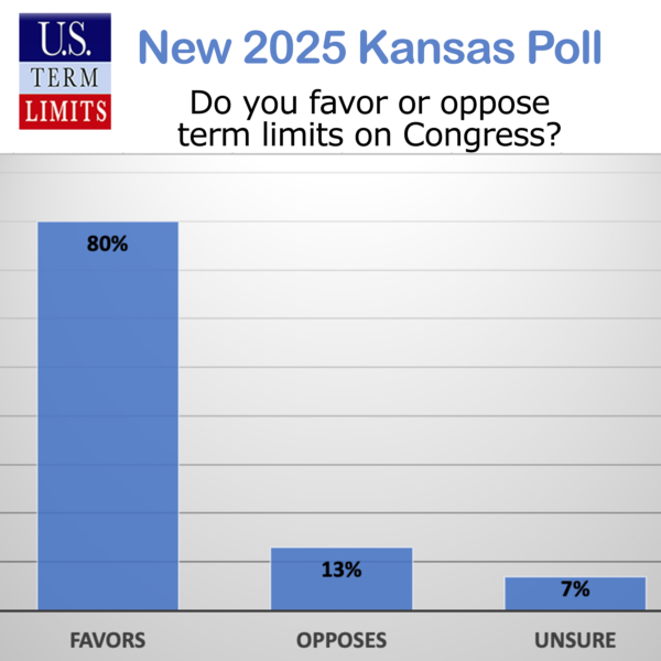 Topeka, KS – A new poll of registered Kansas voters conducted by RMG Research on January 2-7, 2025 found an overwhelming 80% favor term limits for Congress.  This reflects sentiments in favor of congressional term limits in other states as well.  The poll showed that 76% of Kansans would want their state senator and state representative to favor legislation calling for a convention to propose congressional term limits.