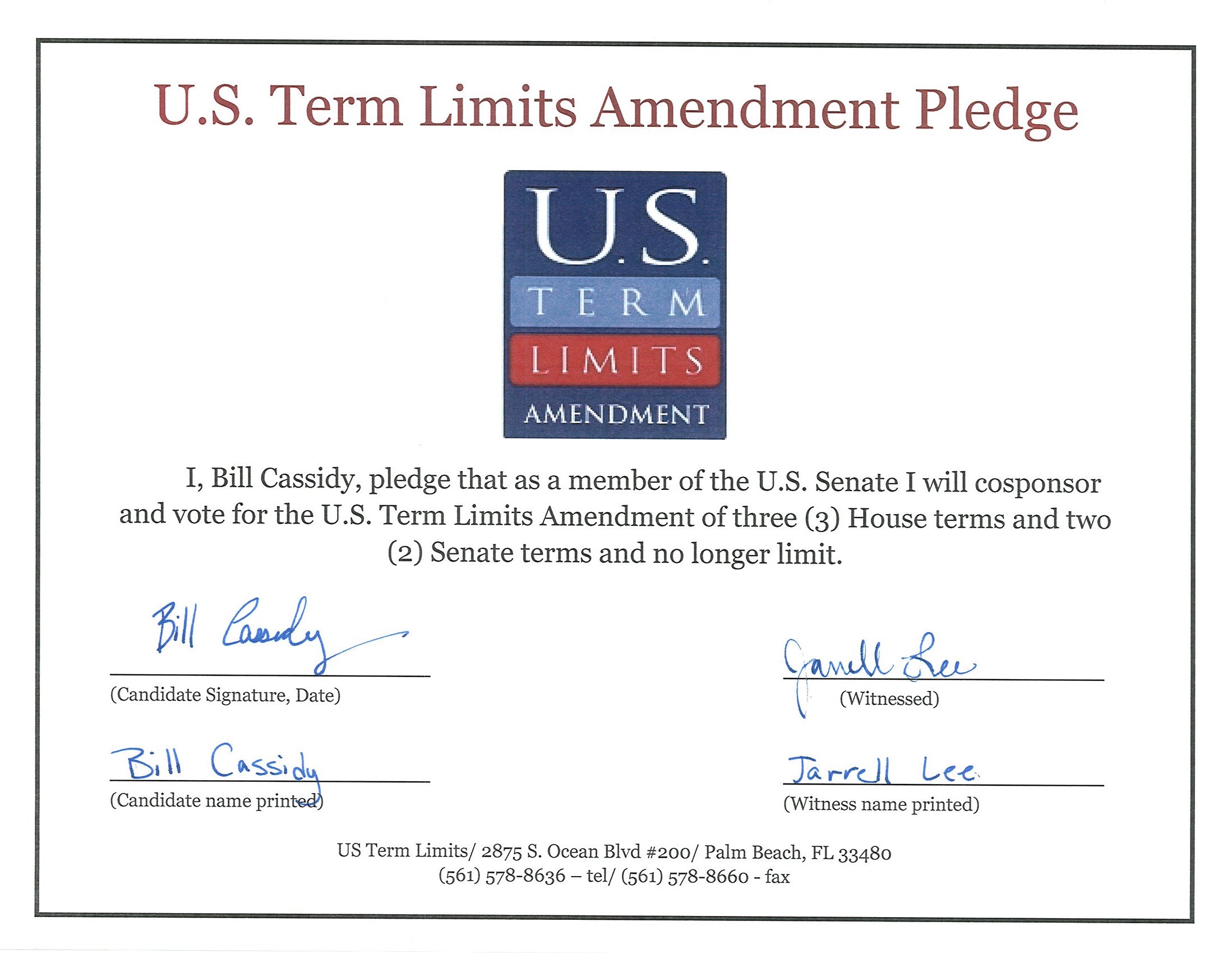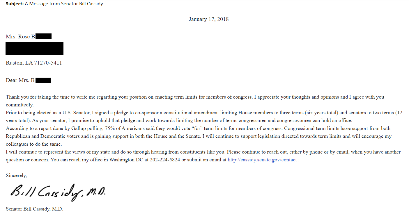 [music]Philip Blumel: For US, Senator Bill Cassidy of Louisiana, it’s not enough to lie, he has to spit in your eye afterwards. For this Senator Cassidy is the focus of this week’s scofflaw report. When US representative Bill Cassidy was making his career leap to become a US Senator Cassidy, he made a popular promise to his constituents. He signed the US Term Limits Congressional pledge, in which he committed himself to “Co-sponsor and vote for the US Term Limits amendment of three House terms and two Senate terms and no longer limit.” You can see a copy of his pledge signed by Cassidy and a witness at termlimits.com. Of course, Cassidy had seen the polling. We know this because in a letter to a constituent that USTL has in its possession, Cassidy wrote that, “According to a report done by Gallup Polling, 75% of Americans said they would vote for term limits for members of Congress.”