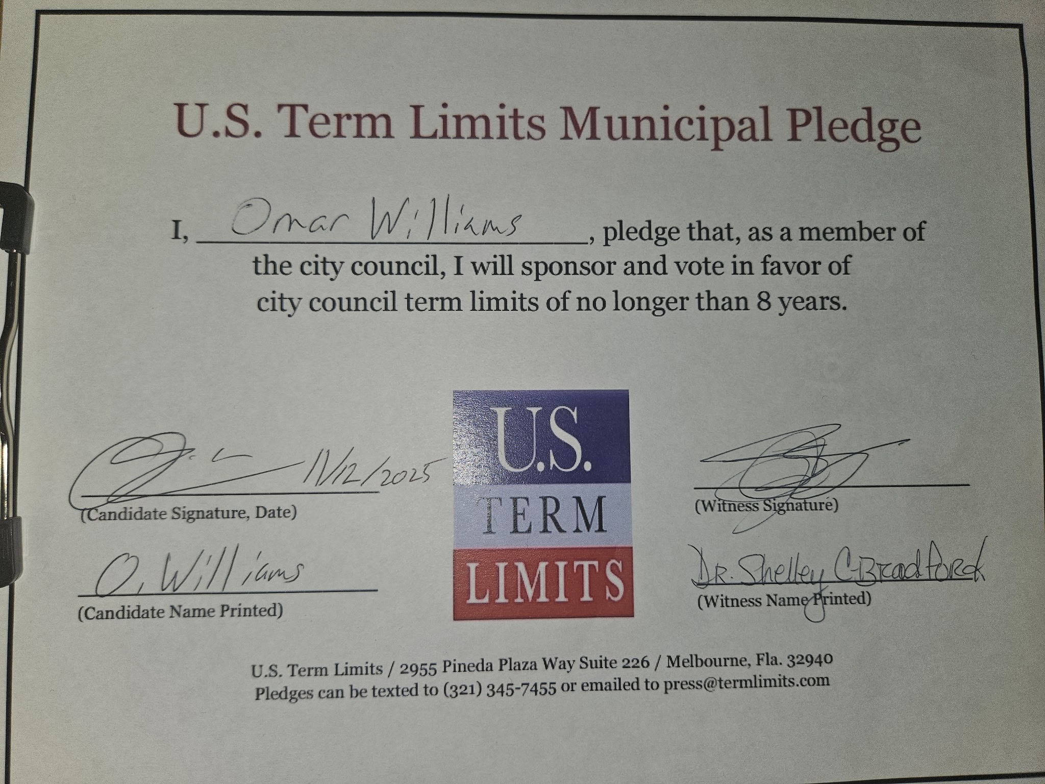 San Bernardino, CA – 2025 San Bernardino city council candidate, Omar Williams (1st Ward), signed the Term Limits Municipal Pledge supporting term limits on all elected city council members. U.S. Term Limits praises Williams for his commitment to this important issue. Williams says, “I believe that no position should hold office longer than 8 years. If elected I will only serve 8 years in City Council. “