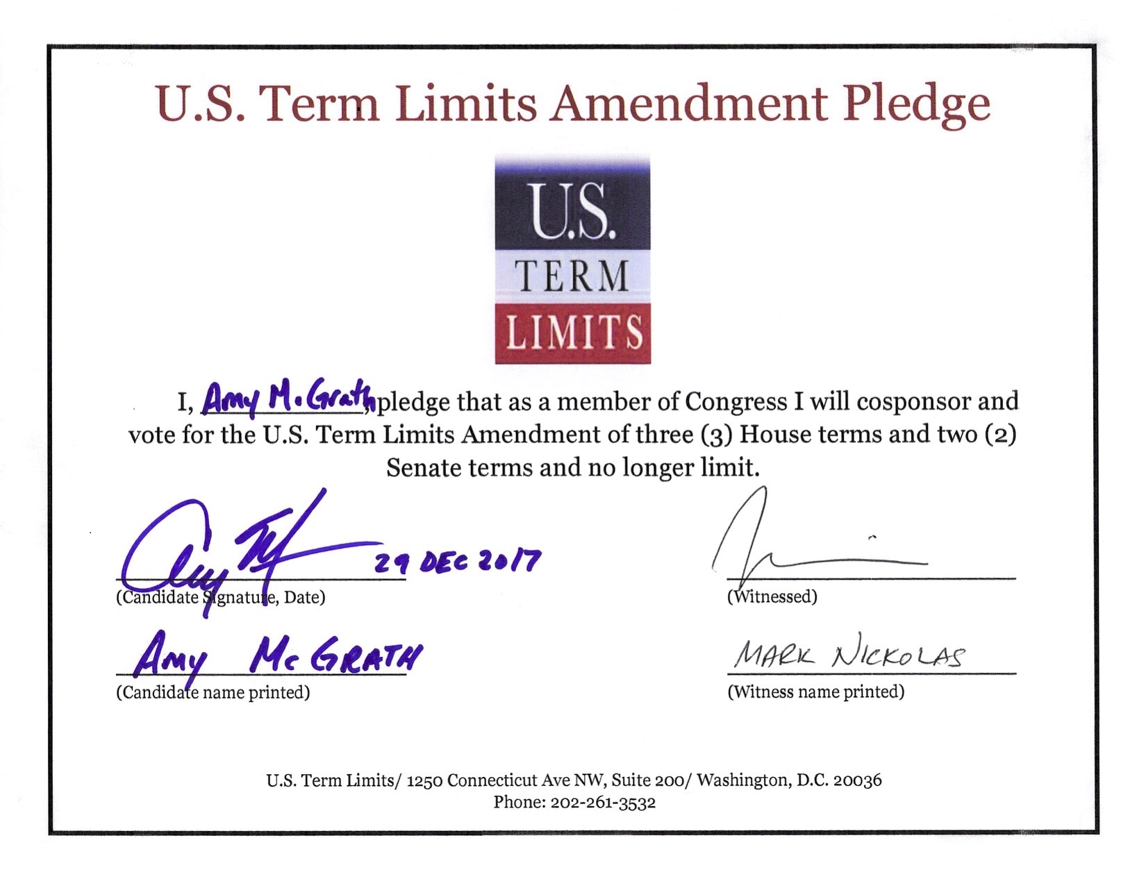 The U.S. Term Limits amendment pledge is provided to every announced candidate for federal office. It reads, “I pledge that as a member of Congress, I will cosponsor and vote for the U.S. Term Limits amendment of three (3) House terms and two (2) Senate terms and no longer limit.”