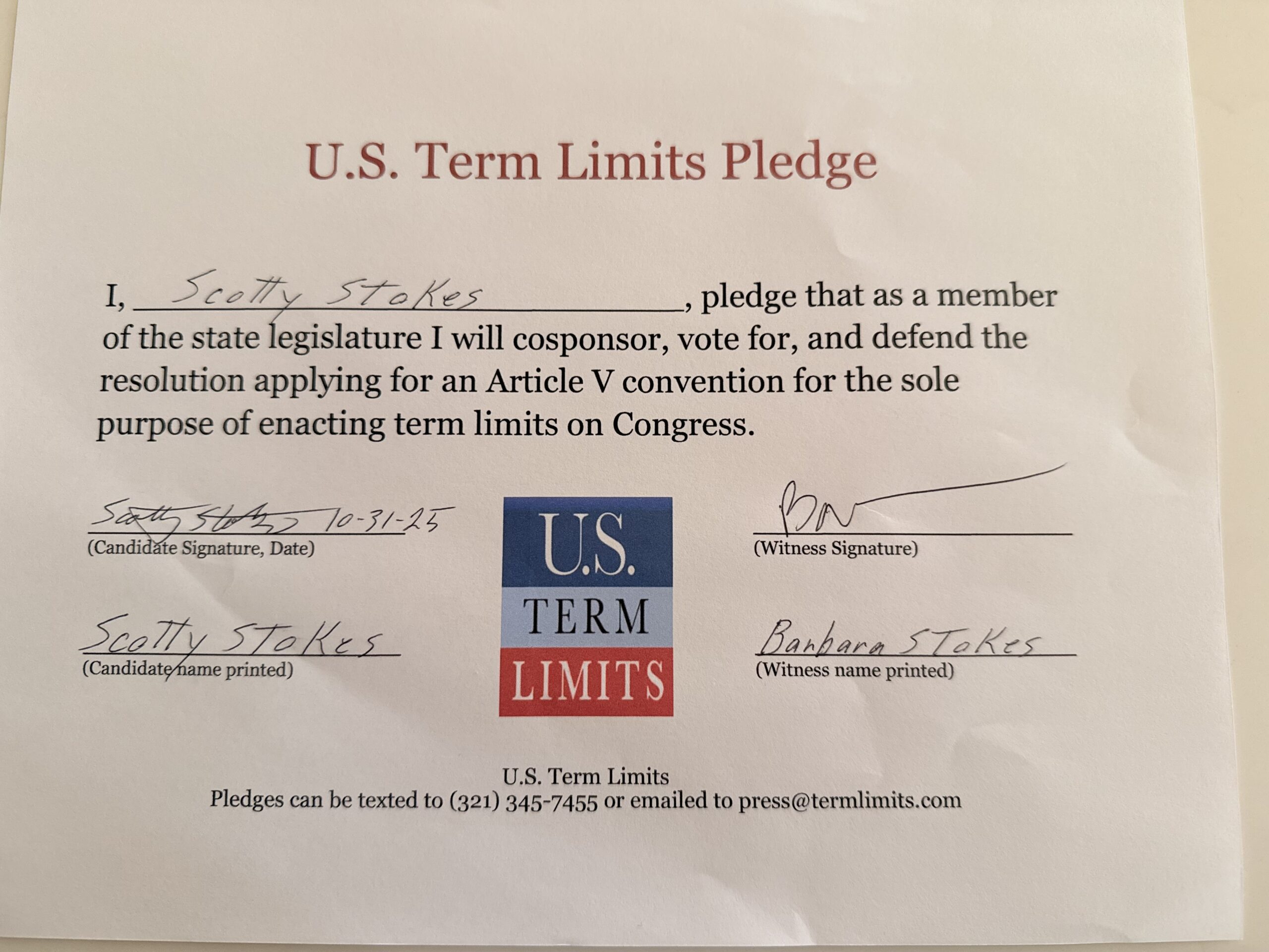 Claremore, OK – U.S. Term Limits (USTL), the leader in the national, non-partisan movement to limit terms for elected officials, is gathering support from state lawmakers across the nation. Its mission is to get 34 states to apply for an amendment proposal convention specific to term limits on Congress. 2026 Oklahoma state house candidate, Scotty Stokes (district 9), has committed support for term limits on Congress by signing the term limits convention pledge. Previously, candidates Nathaniel Butterfield and David White signed the pledge.