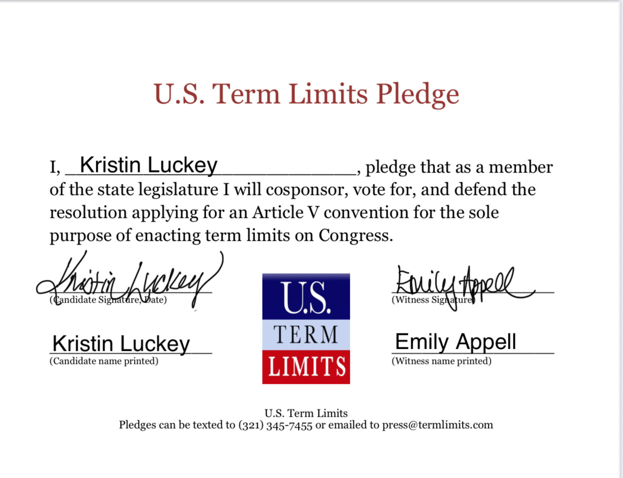 The U.S. Term Limits pledge is provided to candidates and members of state legislatures. It reads, “I pledge that, as a member of the state legislature, I will cosponsor, vote for, and defend the resolution applying for an Article V convention for the sole purpose of enacting term limits on Congress.”