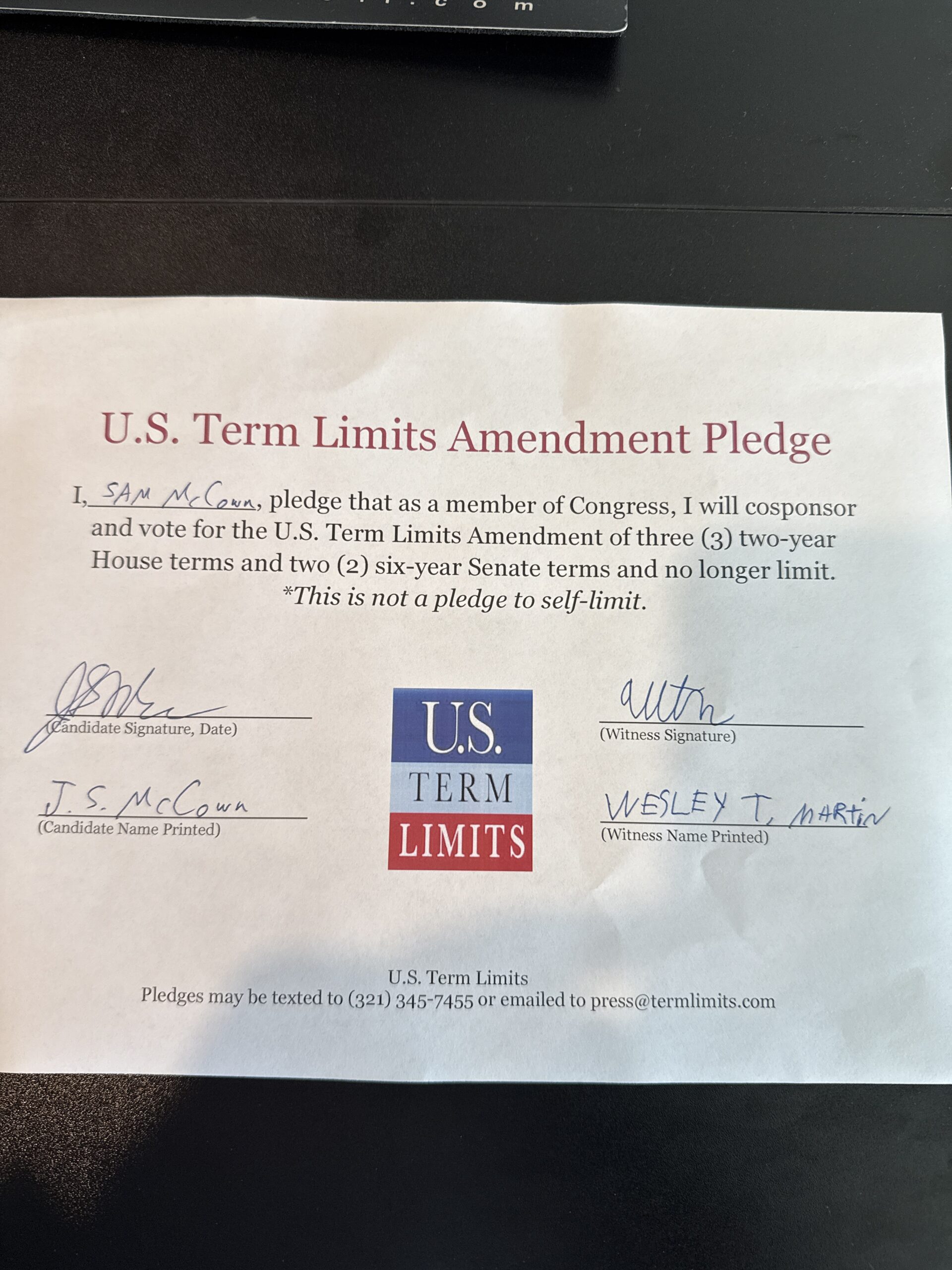 Washington D.C. – U.S. Term Limits (USTL), the leader in the non-partisan national movement to limit terms for elected officials, praises 2026 U.S. House candidate for South Carolina, Sam McCown (District 1), for signing the pledge for an amendment to term limit Congress. Previously, candidate Mark Smith also signed the pledge.