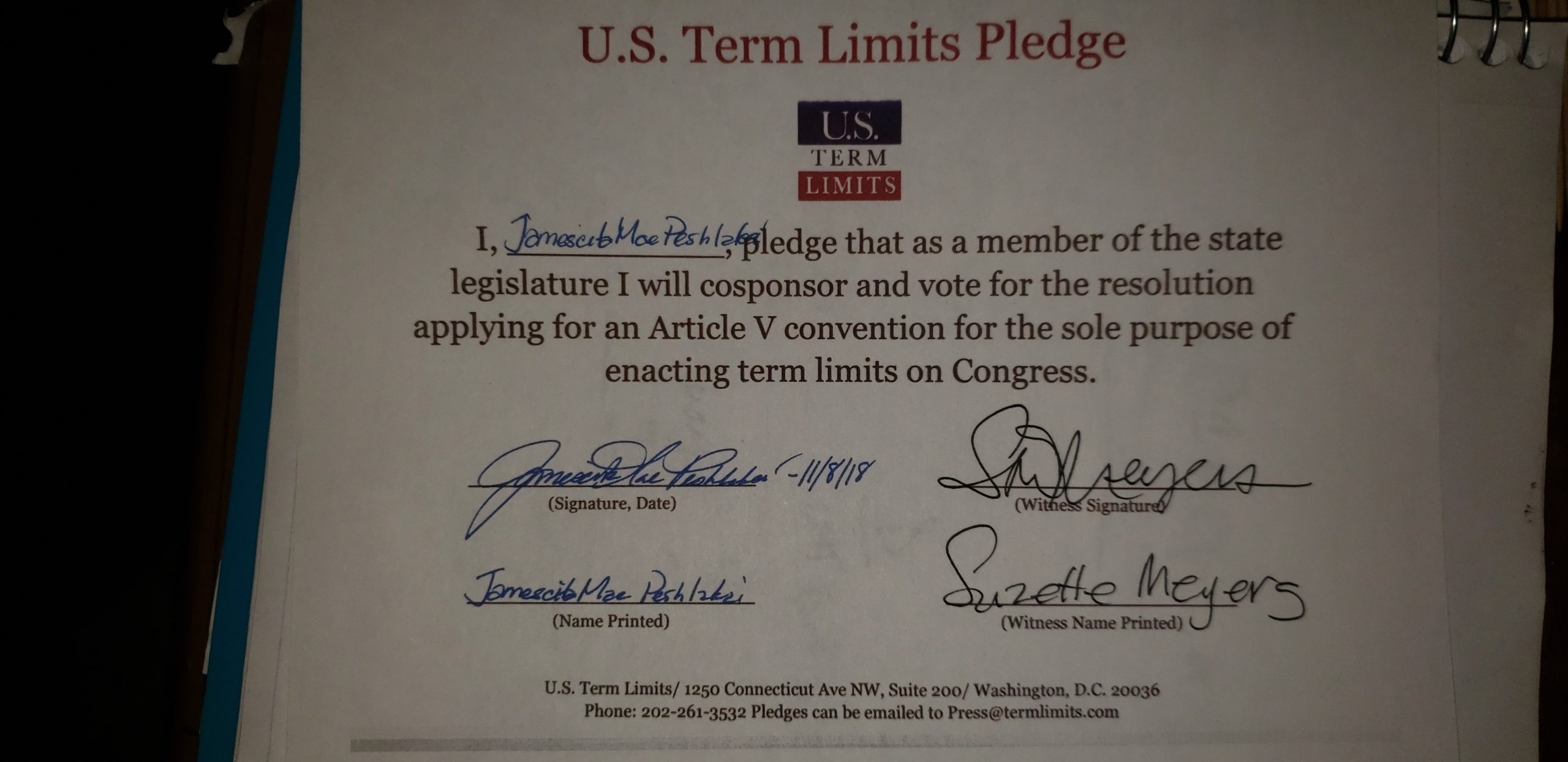 Peshlakai had previously signed a pledge stating “I, Jamescita Peshlakai, pledge that as a member of the state legislature I will cosponsor and vote for the resolution applying for an Article V convention for the sole purpose of enacting term limits on Congress.” View Peshlakai’s signed pledge.