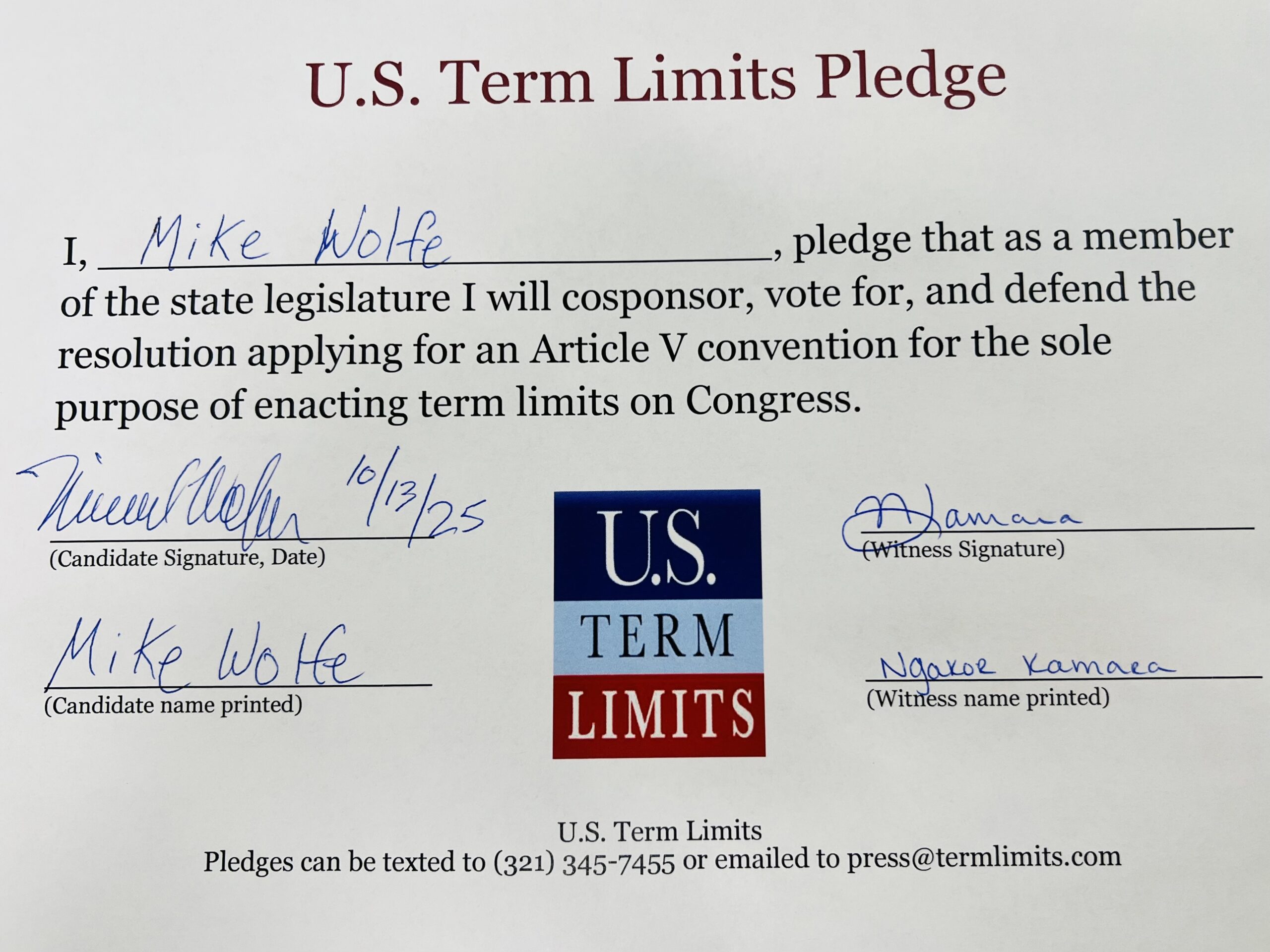 The U.S. Term Limits pledge is provided to candidates and members of state legislatures. It reads, “I pledge that, as a member of the state legislature, I will cosponsor, vote for, and defend the resolution applying for an Article V convention for the sole purpose of enacting term limits on Congress.”