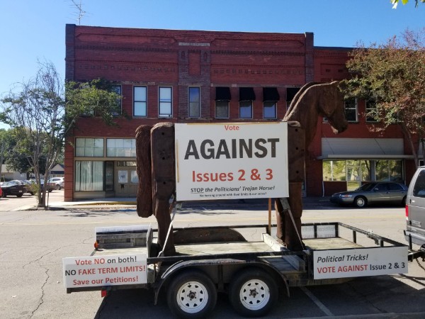 The “Vote AGAINST Issue 2 and Issue 3” campaign will bring a rather large Trojan Horse to 10-ft Tall Trojan Horse Coming to Little Rock, England, and Sheridan, Arkansas. The 10-foot tall carved wooden creature illustrates that Issue 2 and Issue 3 are sneaky, dirty tricks by politicians in the legislature meant to make fools of Arkansas voters.