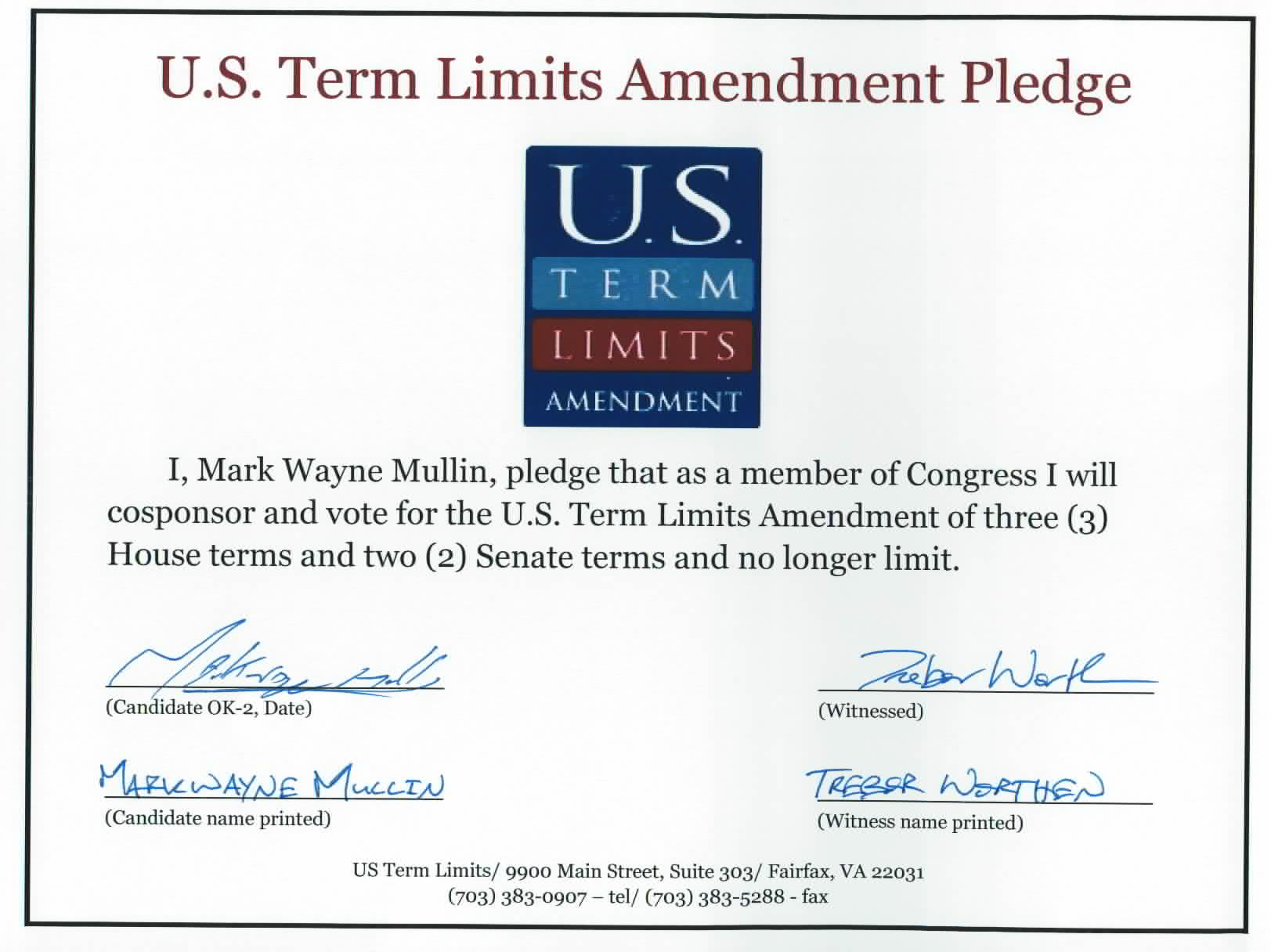 The U.S. Term Limits amendment pledge is provided to every announced candidate for federal office. It reads, “I pledge that as a member of Congress, I will cosponsor and vote for the U.S. Term Limits amendment of three (3) two-year House terms and two (2) six-year Senate terms and no longer limit.”