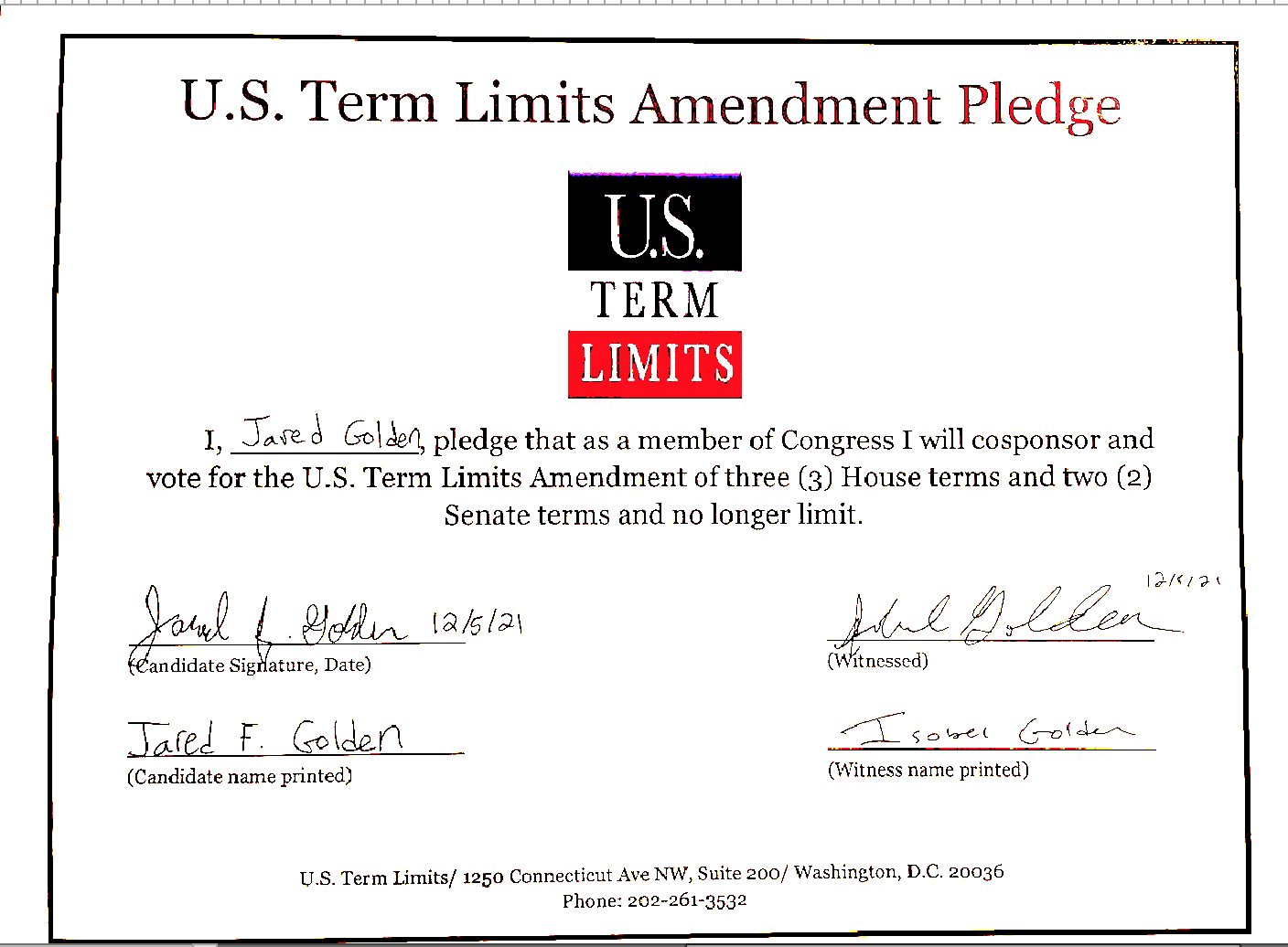 In addition to signing the term limits pledge, Golden cosponsored house joint resolution 12 (HJR12) a measure being spearheaded through Congress by USTL. Members of the U.S. Term Limits team presented Golden with an award inscribed with his pledge vowing that, as a member of Congress, he will cosponsor and vote an amendment of three (3) house terms and (2) senate terms and no longer limit. More than 40 members of Congress have cosponsored the U.S. House and Senate resolutions.
