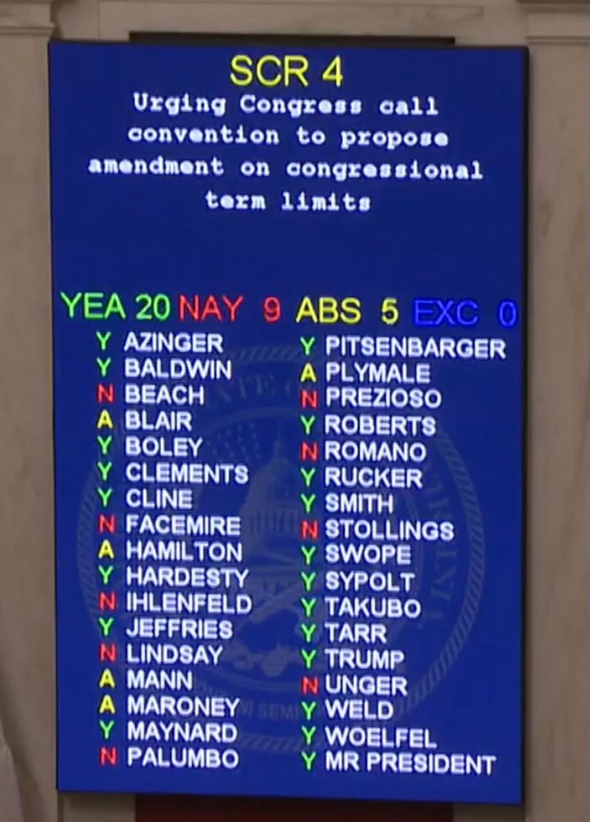 Charleston, WV — The West Virginia Senate just passed a resolution calling for the states to propose a congressional term limits amendment to the U.S. Constitution. Senate Concurrent Resolution 4 (SCR4), led by Senator Randy Smith, passed by a vote of 20 to 9 with 5 abstentions, receiving strong support from both sides of the aisle.